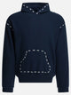 Felpa con cappuccio "Marionette" Kapital con struttura morbida in cotone di peso medio. La costruzione prevede maniche lunghe, cappuccio integrato e silhouette regolare. Lungo il bordo del cappuccio, sulle maniche e attorno alla tasca frontale sono presenti cuciture decorative a contrasto. La tasca a marsupio applicata offre spazio funzionale, mentre polsini e fondo sono rifiniti in costina elasticizzata per maggiore tenuta.