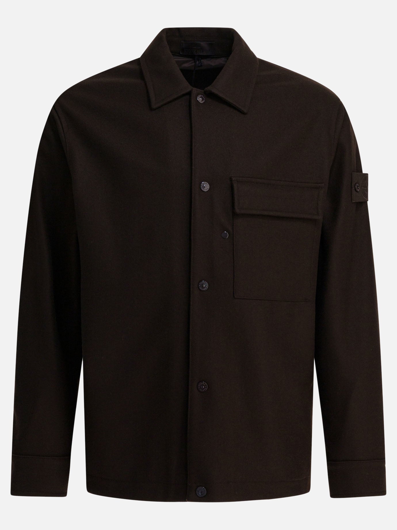 Giacca overshirt in lana Stone Island realizzata con struttura simile a una camicia. La silhouette presenta maniche lunghe, colletto classico e carré nella parte posteriore. Il tessuto principale è una miscela composta all'80% da lana vergine e al 20% da poliammide. La chiusura frontale è dotata di bottoni automatici. Tasche applicate sul petto aggiungono funzionalità, mentre i polsini sono regolati da bottoni automatici. Logo tono su tono applicato sulla manica.