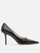 Décolleté "Love 85 mm" Jimmy Choo, costruzione a silhouette affusolata e struttura rigida. Realizzata con tomaia in pelle e taglio alto sul collo del piede per una maggiore copertura. Punta appuntita, tacco a spillo di medio profilo. Interno completamente foderato in pelle. Suola realizzata in cuoio, bordi netti e cuciture ridotte, linee minimaliste senza sovrapposizioni visibili.