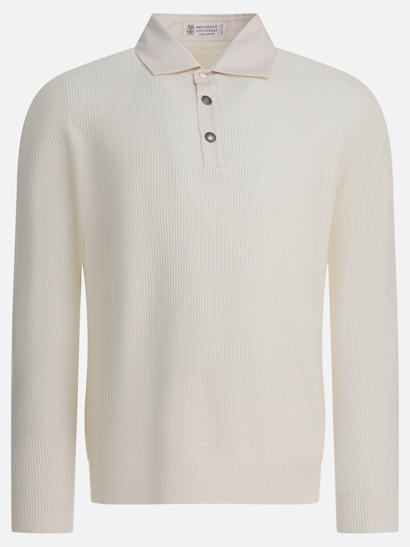 Brunello Cucinelli ribbed knit polo shirt made of pure cashmere, worked with an English rib technique that gives a compact structure and regular profile. The cut features regular volumes, with a linear silhouette and minimal details. The French twill collar, recognizable by its diagonal weave, adds a textural variation on top. Soft, lightweight fibers bring thermal insulation and lightness.