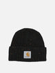 Carhartt WIP's "Anglistic" cap, made of ribbed stretch fabric, features a salt-and-pepper knit that gives a visually defined texture. The fitted construction ensures a stable fit, while the cuff is secured by an artificial horn button located on the back. The surface incorporates a square label, sewn prominently on the front.