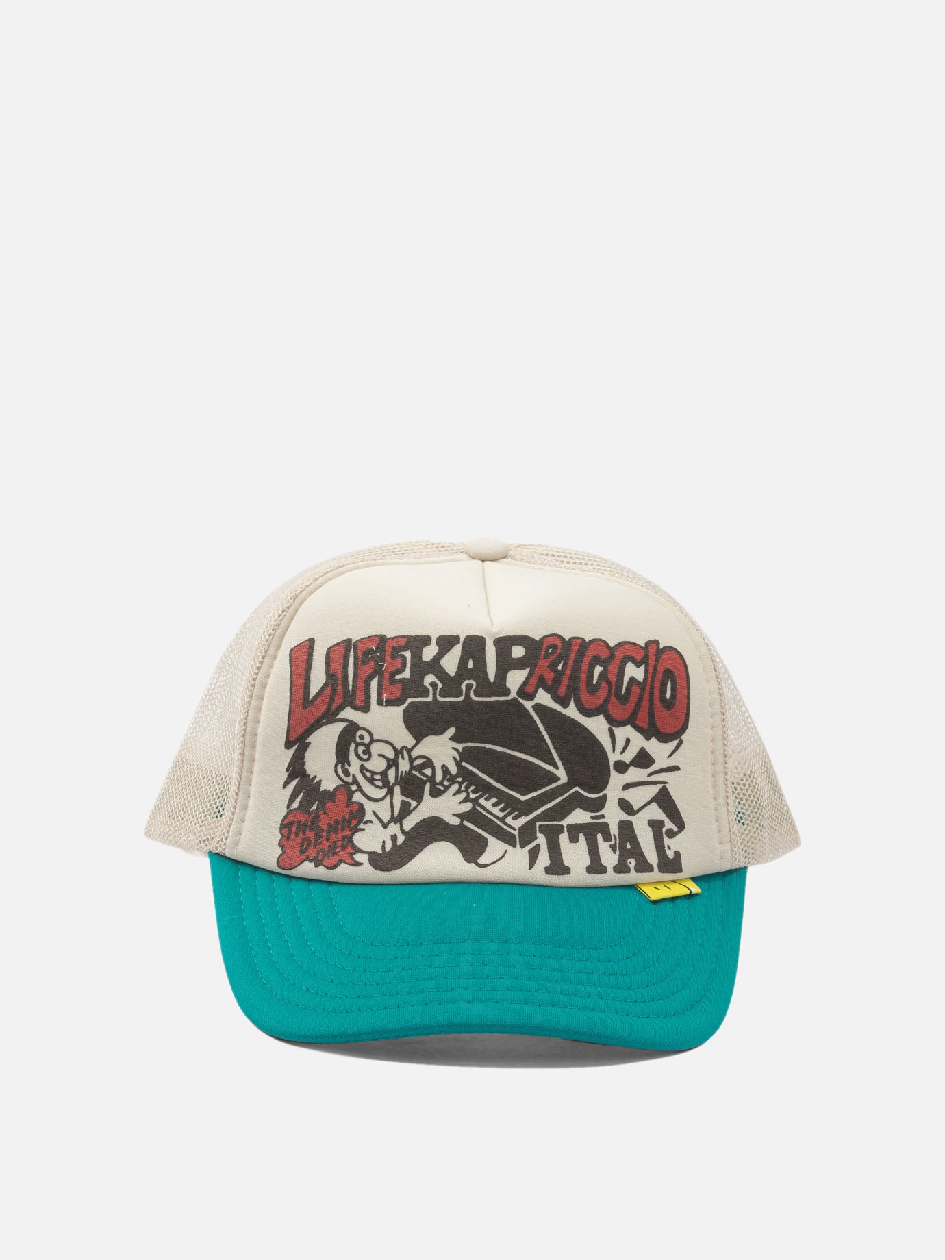 Kapital "Life Kapriccio" trucker hat with six-panel construction and pre-curved visor. Made of polyester fabric, it features a lightweight construction with a reinforced front and perforated back panels to promote ventilation. The design includes a "Life kapriccio" print applied to the front. The silhouette follows classic lines and an adjustable fit via rear snap closure.