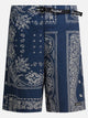 Kapital paisley print shorts featuring a cotton construction. The pattern features a patchwork construction, made with panels that echo the paisley bandana design. The silhouette is loose-fitting, with an adjustable waist via an integrated drawstring. A zippered back pocket and side welt pockets for added convenience complete the garment. Reinforced seams add strength to the garment.