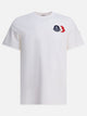 Moncler tricolor logo T-shirt made of organic cotton jersey with a compact structure and uniform surface. The garment features a regular, linear silhouette designed with essential seams. The collar is round, while the sleeves are short and finished with flat edges. Embroidered inserts enhance the front, providing a brand-identifying focal point. The fabric ensures lightness and a soft feel against the skin.