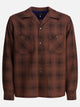 Needles check wool "One-Up" shirt made from wool main fabric features a long-sleeved construction with a classic collar. The construction includes two patch pockets on the chest, each with a button closure. Adjustable button cuffs and a yoke establish the fit along the back. The front closure uses a series of buttons in a vertical line.
