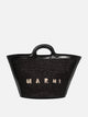 Marni "Tropicalia" handbag made of leather and raffia-effect fabric panels. Rigid structure with compact silhouette, reinforced leather bottom. Short handles with embossed details, leather top closure. Shoulder strap, attached by metal snap hooks, is detachable and adjustable. Marni logo is embroidered on the front. The metal elements feature a gold finish.