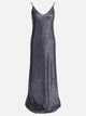 Semper sequin long dress features a surface entirely covered with applied sequins on a lightweight base. The construction follows a flowing silhouette with a loose fit, defined by a slightly flared hemline. The design features a front V-neckline supported by thin double straps, while the back shows a crisscrossing of straps that leaves the back uncovered for essential structure and fluid movement.
